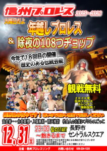 12/31の夜は、信州プロレスリング主催の「年越しプロレス&除夜の108つチョップ」。 セントラルスクゥエア沿道エリアで、2年詣りの参拝客に向けて行う恒例イベント。 観覧・観戦無料。23:00頃から開始(~終了未定)。