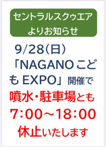 ウォーターサバゲーあり、縁日駄菓子ブースあり、書道パフォーマンスにダンスあり、謎解きゲームなどなど、こどもが楽しめるコンテンツが盛りだくさん! こどもがメニュー決めから調理・販売まで行う本格屋台「こどもチャレンジマーケット」もあり! 長野産ソルガム(穀物)を使用したハンバーガー、ドーナツ、かき氷を販売する予定。各種100食限定。 10:00~16:00開催。 主催/長野青年会議所 青少年共創委員会 これにより、駐車場の閉鎖・噴水が以下のように休止となります。 7:00~18:00
