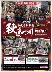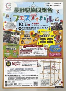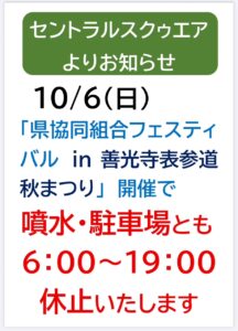 10/5(日)は「長野県協同組合フェスティバル in善光寺表参道秋まつり」が開催されます。 10:00~15:30。県内の農産物・加工食品などの販売ブースが大集合します! 沿道では「善光寺表参道秋まつり2025」を同日開催(10:00~16:00)。 町神輿やちんどん屋が練り歩き、三陸大船渡さんままつりも行われるなど賑やかな一日となります。 セントラルスクゥエア前に置かれる善光寺表参道秋まつり本部テントでは、沿道商店会協賛のお買物券抽選会を行います。 これらイベントのため噴水は休止、駐車場は6:00~19:00閉鎖となります。