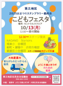 今週末3連休はセントラルスクゥエアもイベントが目白押しです。 10/11(土)は長野陸上競技協会の主催で「Jumping Festa」が開催されます。走高跳に特化したイベントです。 午前中は小学生ジャンプクリニック、午後は13時から中学・高校・一般の走高跳競技会が行われます。 トップアスリートによる迫力の走高跳競技が間近で見られるチャンス! 見学・観覧は自由です。 10/12(日)は「長野まえdeミュージックフェス」が開催されます。 全部昭和のヒット曲!をキーワードに、8組のグループがステージを盛り上げます。 ピンクレディにYMO、チューリップにビートルズ、その他お馴染み昭和のJ-POPが満載です! グルメ屋台の美味しいものを頬張りながら楽しんでください。11:00~17:00 10/13(祝)は第三地区住民自治協議会の「こどもフェスタ」が開催されます。 12:30から地元小中学校の合唱などの発表が行われたあとは、大ビンゴ大会も! 大岡産直の市では昔ながらのとっかん販売、また森と木ラボによるわたあめ販売もあります。 以上のイベントにより、噴水は休止となります(Jumping Festa設営のため10日午後14時頃から休止します)。 セントラルスクゥエア駐車場は10/11が6:00~18:00閉鎖、12日・13日は平常営業します。![]()
