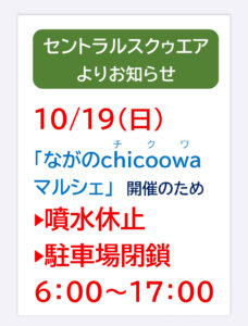 今週10/19(日)は、ハンドメイド作家作品の販売イベント「ながのchicoowa(チクワ)マルシェ」が開催されます。 約30店舗ほどのクラフト出店があり、ワークショップを行う店舗も半数ほど。 キッチンカーやグルメブースもあって、美味しいものも楽しめそう! 10:00~15:00開催。 これにより、噴水は休止(夕方再開)、駐車場はあさ6:00~17:00閉鎖となります。