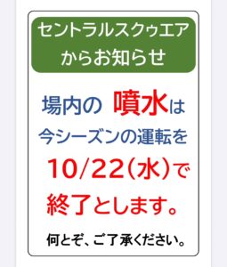 セントラルスクゥエアの噴水は、今季の運転を10/22(水)をもって終了とさせていただきます。 どうぞご了承ください。
