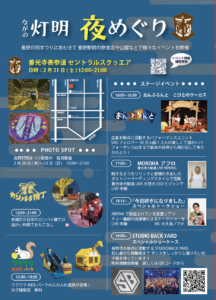 第23回長野灯明まつり(2/20~23)に合わせ、セントラルスクゥエアでも2/21(土)にイベントを開催します。 ★アフロのLIVEビジョン中継 17:00~ 善光寺大勧進・萬善堂で行われるラッパー、アフロのLIVEをセントラルスクゥエアの大型LEDビジョンで生中継! (唯一無二のラップユニット”MOROHA”の活動を2024年末に休止したが、現在はソロでアフロとして音楽、文筆、映画等でも活動中。シンガー、ヒグチアイとのユニット”天々高々”としても音楽活動の幅を広げています) ★『今日、好きになりました。』スペシャルトークショー中継 18:15~ 続けて大勧進・萬善堂で行われるABEMAで配信中の恋愛リアリティー番組「今日、好きになりました」の参加メンバーによる、長野灯明まつりスペシャルコラボトークショー(MC/大久保ノブオ)の模様を生中継。 以上LEDビジョン中継のほか、ステージでは… ★おんぷらんと「こびとのサーカス」 16:00~16:30 SNSフォロワー総数30万超え、2人組パフォーマンスユニットの楽しくて温かい絵本の世界から飛び出してきたかのようなステージ! ★STUDIO BACK YARD スペシャルショーケース 19:00~ 長野市を拠点に活動するダンスチームのパフォーマンス 広場では… ◆ワクワクKIDSパーク(ふわふわ遊具) 12:00~19:00 子ども限定・無料 ◆カンパイ横丁 12:00~21:00 屋台で温かい料理を提供 ◆フォトスポット 灯明まつり期間中(20日~23日) 18:00~21:00![]()