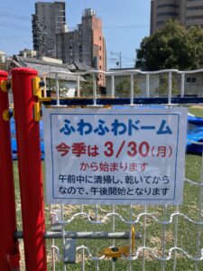 お待たせしております、ふわふわドームの今季運転開始は3/30(月)と決まりました。 午前中に清掃し、遊具表面が乾いてからなので、午後開始となる見込みです。 お待ちいただいている皆さま、もう少しお待ちくださいね!